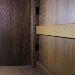 本棚などの強度を上げる伝統的な技法。たて板によこ板を突き通し、たて板にそってくさびを打ち込みます。くさびを打ち込むことにより、たて板をしっかりと固定、反りを防ぐことにより、棚の強度を上げています。