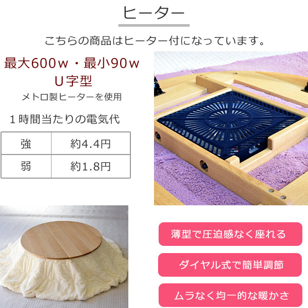 ・こちらの商品はヒーター付きです。 ・画像にありますこたつ布団・クッション・座椅子は商品に含まれておりません。 ・脚は折りたたみ式です。 ・構造上、サイズは105cm~となります。 ・高さ変更は別途工賃がかかります。 (高くする場合:商品代金+3300円・低くする場合:商品代金+1100円) ・高くする場合、折りたたみ式の構造上、限界がありますので、詳細はお問い合せ下さい。 ・上記サイズ表以外のサイズオーダーはメールまたはお電話にてお問い合わせください。 ・製品によって木目が異なります。 ・無垢材(自然素材)ですので、直射日光やエアコンの熱が直接当たる使用は割れの原因となりますのでご注意ください。 |