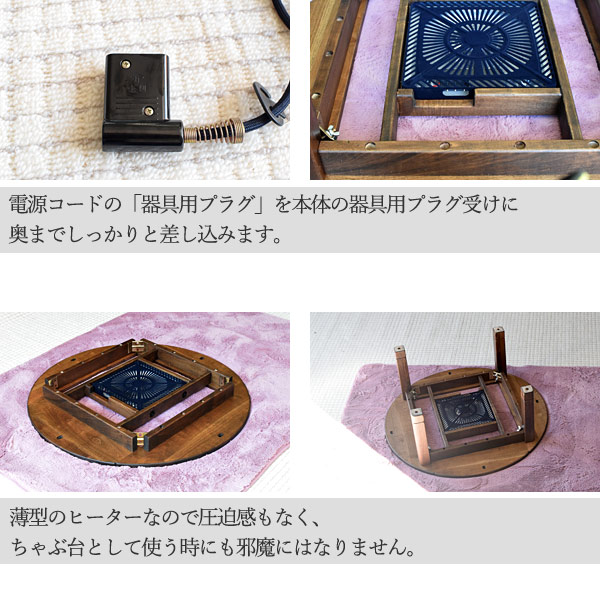 | 【天然木】【自社生産】【送料無料】 無垢の円形こたつです。ヒーター付き・脚脱着可能固定脚タイプです。継ぎ脚も付いています。 |