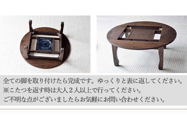 | その他 | ・画像にありますこたつ布団・クッション・座椅子は商品に含まれておりません。 ・脚は折りたためません。ネジ式で取り外しはできます。 ・高さ変更は別途工賃がかかります。 (高くする場合:商品代金+3300円(税別)・低くする場合:商品代金+1100円(税別)) ・高くする場合、折りたたみ式の構造上、限界がありますので、詳細はお問い合せ下さい。 ・サイズオーダーはメールまたはお電話にてお問い合わせください。 ・製品によって木目が異なります。 ・無垢材(自然素材)ですので、直射日光やエアコンの熱が直接当たる使用は割れの原因となりますのでご注意ください。 |