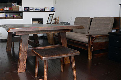 | ご自宅を“古民家風”にリフォームされ、そのイメージ合った家具をお探しのところ、ホームページで久遠の存在をお知りになったとの事。隣県からわざわざショールームにお越し下さいました。当時、展示してあったダイニングテーブルの皮付き天板を大変気に入って頂き、『この天板を使って座卓を・・・』とのご依頼を頂きました。ソファーは展示してあった3点から、実際に目で見て、手に触れ、座って頂き、『座・リビング』をご選択されました。当初、お届けした座卓は高さが35センチ。後に座・リビングの高さに合わせて座卓の高さ変更のご相談を頂き、新たに脚のみお作りし、現在はセンターテーブルとしてご利用いただいております。久遠の家具はオーダーメイドが可能ですから、このようなご依頼にも対応ができるのです。 |